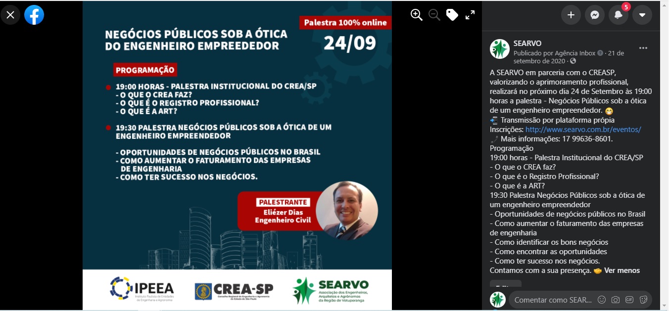 No dia 24, próxima quinta-feira, o encontro será com o Eliézer Dias, Engenheiro Civil. O tema abordado será Negócios Públicos sob a ótica do engenheiro empreendedor. ????